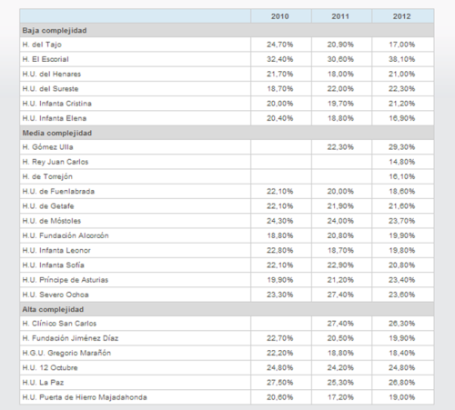 [Imagen 1: Tasas de cesáreas según hospital y complejiidad, Comunidad de Madrid 2010- 2012]