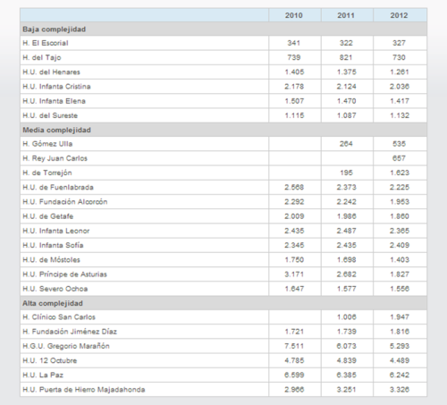 Las cifras difieren bastante de un centro a otro, pero en negativo cabe destacar las del Hospital del Escorial, con un 32,40% en 2010 que llegó a un 38,10% en 2012, sin variar prácticamente el nº de partos atendidos en su servicio. Todos los hospitales superan los porcentajes de cesáreas recomendados por la OMS (entre un 10% y un 15%) excepto el Hospital Rey Juan Carlos en 2012, con un 14,80%.