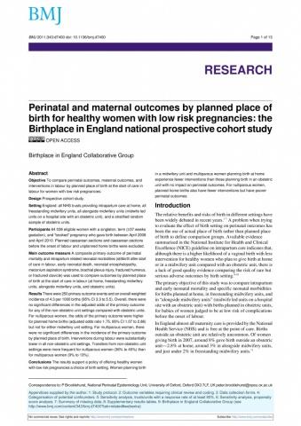 "Perinatal and maternal outcomes by planned place of birth for healthy women with low risk pregnancies: the Birthplace in England national prospective cohort study"