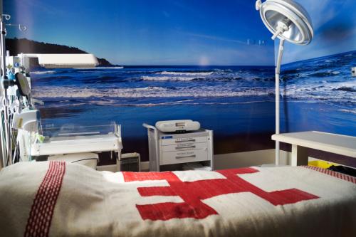 La sala de parto intercultural es un lugar especial. Además de todos los aparatos que monitorean la llegada de un bebé y de la salud de la mamá, están presentes dos símbolos de protección muy importantes y significativos para las comunidades huilliche: la cama está cubierta con una colcha en la que esta tejido un pillán y hay una gigantografía en la pared de la roca del abuelito Huenteao. En la habitación durante el alumbramiento las luces son tenues y cada mujer decide en qué posición quiere dar a luz, aunque normalmente es sobre la camilla semi sentada, de manera que queden en posición más vertical. La medicina alópata solo interviene en caso que sea necesario y es la mujer quien hace el trabajo de parto.