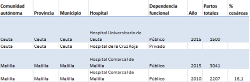 Tasas de cesáreas por hospital y otros datos disponibles: CEUTA Y MELILLA
