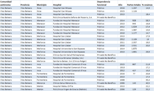 Tasas de cesáreas por hospital y otros datos disponibles: ISLAS BALEARES