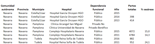 Tasas de cesáreas por hospital y otros datos disponibles: NAVARRA