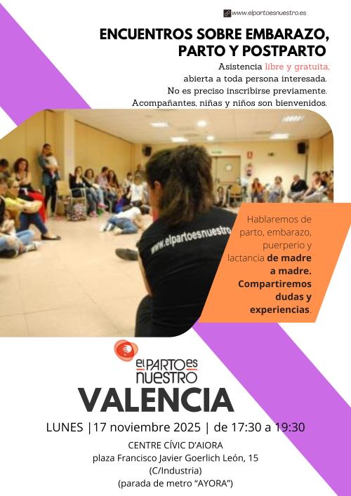 Puedes inscribirte en nuestro mailing de eventos de Valencia para recibir en tu correo electrónico la fecha de cada reunión y de otros eventos de El Parto es Nuestro en nuestra provincia. Para hacerlo, pide tu alta rellenando el siguiente FORMULARIO