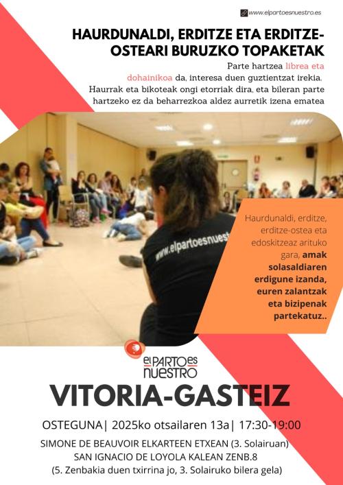 Hablaremos de parto, embarazo, puerperio y lactancia. De la situación actual de la atención al parto en nuestro país, comunidad y barrio. De las recomendaciones de la OMS y el Ministerio de Sanidad para el parto, de nuestros derechos y responsabilidades como usuarios del sistema sanitario, de los derechos del recién nacido...