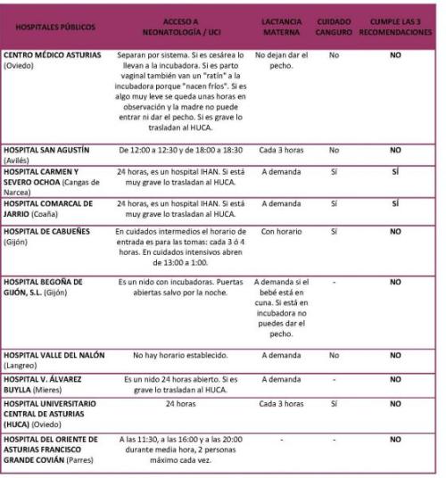 • Se han detectado 10 hospitales o clínicas que tienen Unidades Neonatales, ya sean cuidados intensivos, intermedios o nidos. De estos 10 hospitales, sólo 4 permiten el libre acceso las 24 horas del día a alguno de los dos padres para que puedan acompañar a sus hijos, siendo especialmente reseñable los casos del Hospital San Agustín de Avilés, que sólo permite que la madre puede estar con su hijo dos medias horas diarias, y del Hospital del Oriente de Asturias Francisco Grande Covián, que lo permite durante tres medias horas al día.