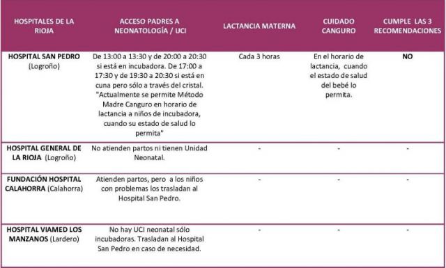 Se ha detectado un hospital con Unidad Neonatal en La Rioja: el Hospital San Pedro de Logroño. Este centro no cumple con las 3 recomendaciones básicas: restringe severamente la entrada de los padres a la Unidad Neonatal en la que sus hijos están ingresados, somete la lactancia materna a restricciones horarias, y dice tener implementado el Método Madre Canguro, aunque el tiempo permitido de acceso no es suficiente para realizarlo.