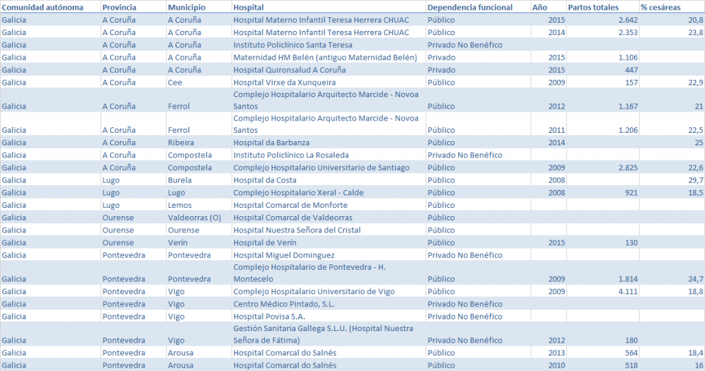 Tasas de cesáreas por hospital y otros datos disponibles: GALICIA
