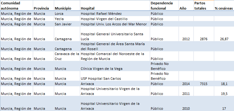 Tasas de cesáreas por hospital y otros datos disponibles: MURCIA